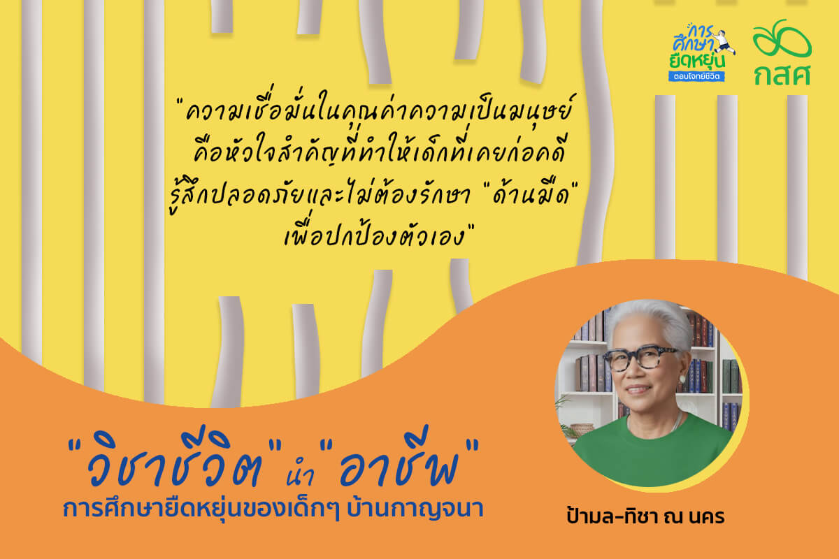 คำถามนี้ไม่ใช่การปฏิเสธความสำคัญของการมีงานทำ แต่คือการชวนให้ย้อนกลับไปมองรากที่แท้จริงของปัญหา ตลอดกว่า 20 ปีที่บ้านกาญจนาภิเษก ป้ามลสร้างระบบการเรียนรู้บนความเชื่อที่ว่า ถ้าเปลี่ยนวิธีคิดได้ พฤติกรรมจะเปลี่ยนตามเอง และถ้าให้ชีวิตได้ก่อน เด็กจะไปหาอาชีพได้เอง