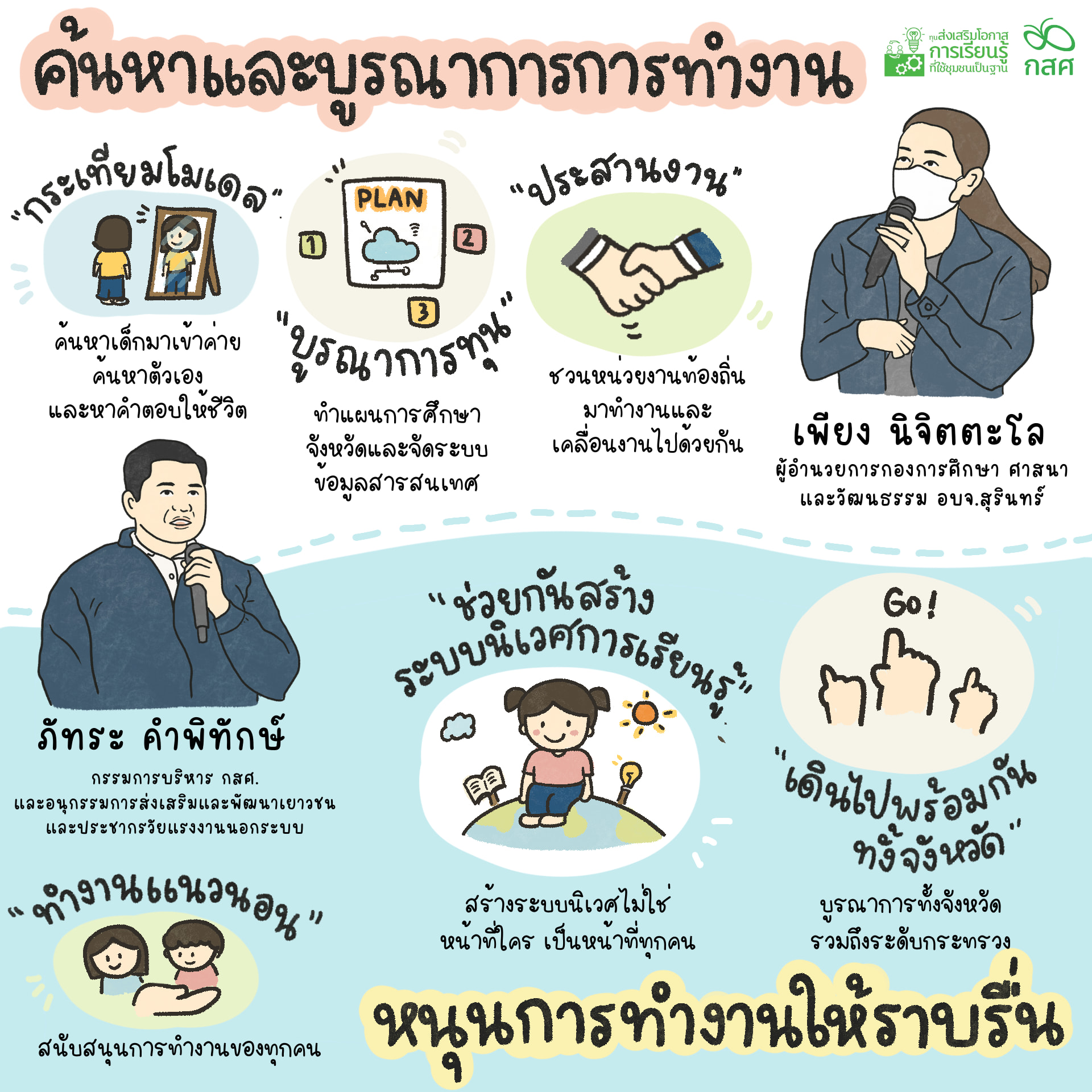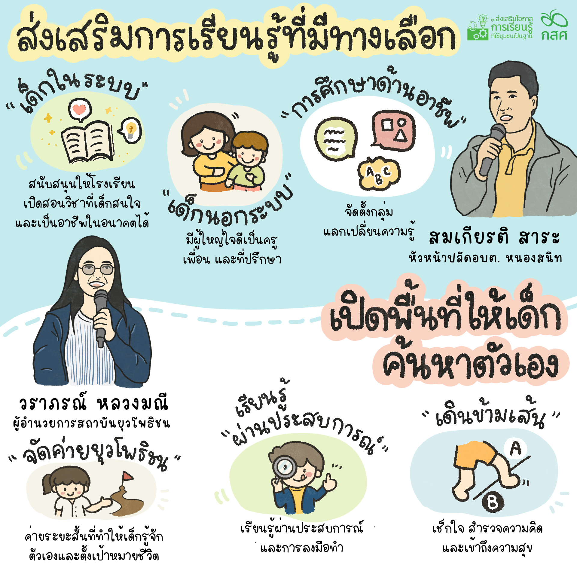 เพราะการเรียนรู้ที่ตอบโจทย์เด็กต้องมาจากความต้องการของพวกเขาเอง แต่หน้าที่ของผู้ใหญ่ คือ การเป็นผู้สนับสนุน ประสานการทำงาน ทำให้การเรียนรู้เกิดขึ้นได้ทุกที่ ทุกเวลา ไม่จำกัดแค่การเรียนในห้องเรียน
