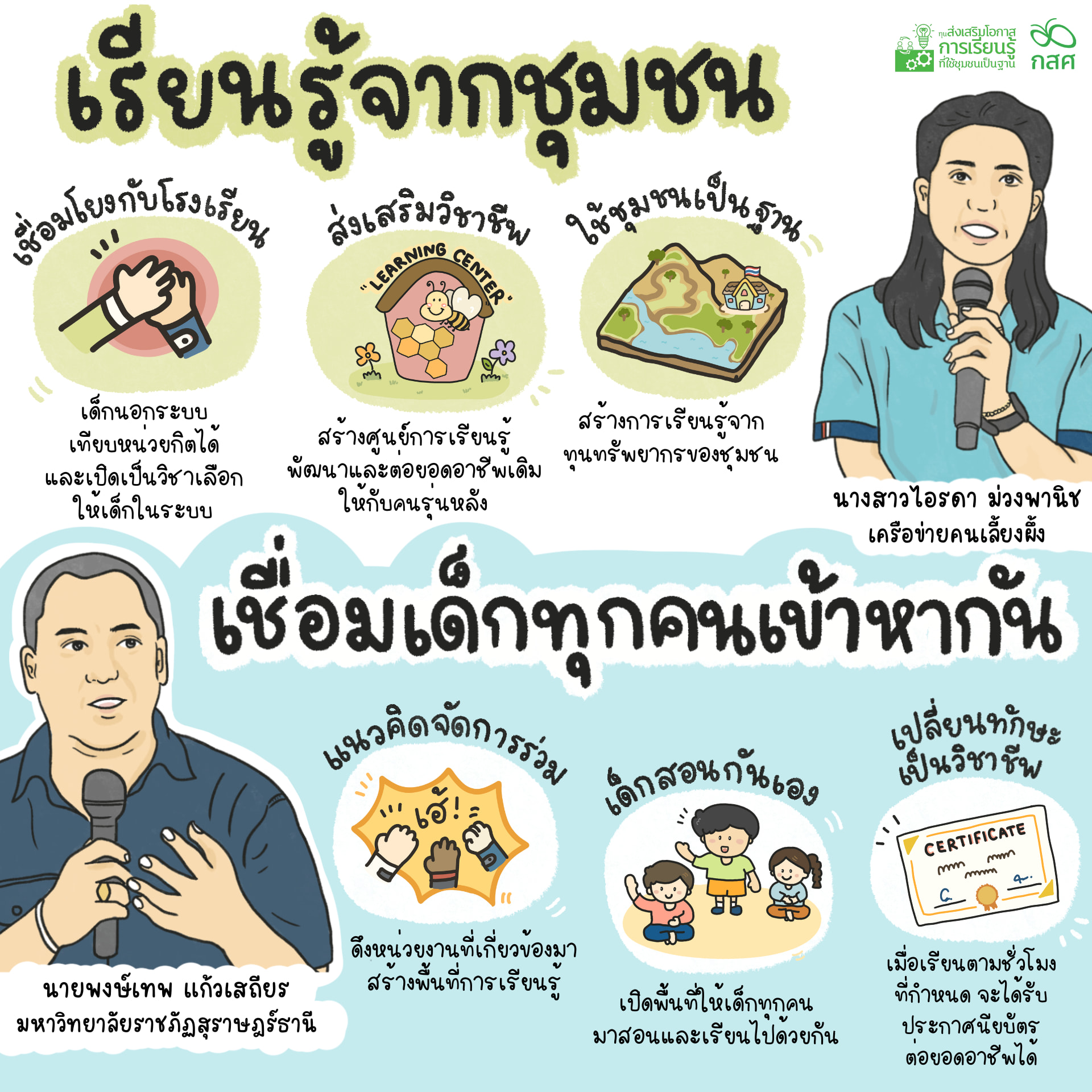 เพราะในหลายๆ พื้นที่ การเรียนรู้อาจจะเริ่มต้นจากการแลกเปลี่ยน การส่งต่อทักษะและเรื่องราวของคนในชุมชนที่สร้างแรงบันดาลใจให้คนรุ่นหลังนำไปต่อยอดและเลี้ยงดูตัวเองได้ในอนาคต